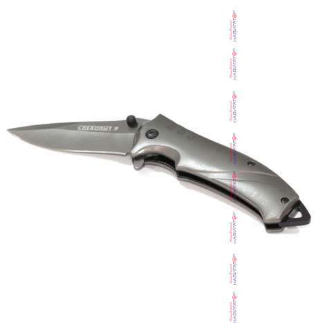 Складной нож с металлической рукояткой, длина рукоятки 12,5 см. Оборудован клипсой для фиксации ножа к ремню, комплектуется тканевым чехлом для хранения и крепления к ремню. Открывается легко одной рукой. Имеет фиксатор лезвия.